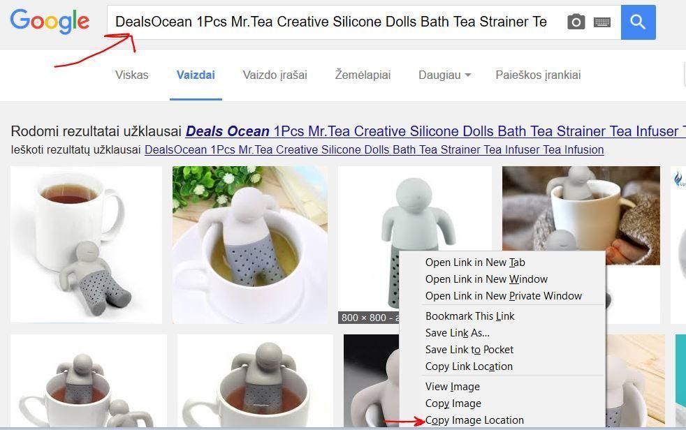 Šiuo būdu google paieška išmes rezultatus visame internete, ne tik Aliexpress. Neradus mažo prekės paveiksliuko, galima nusikopijuoti prekės pavadinimą ir įvesti į Google vaizdus.