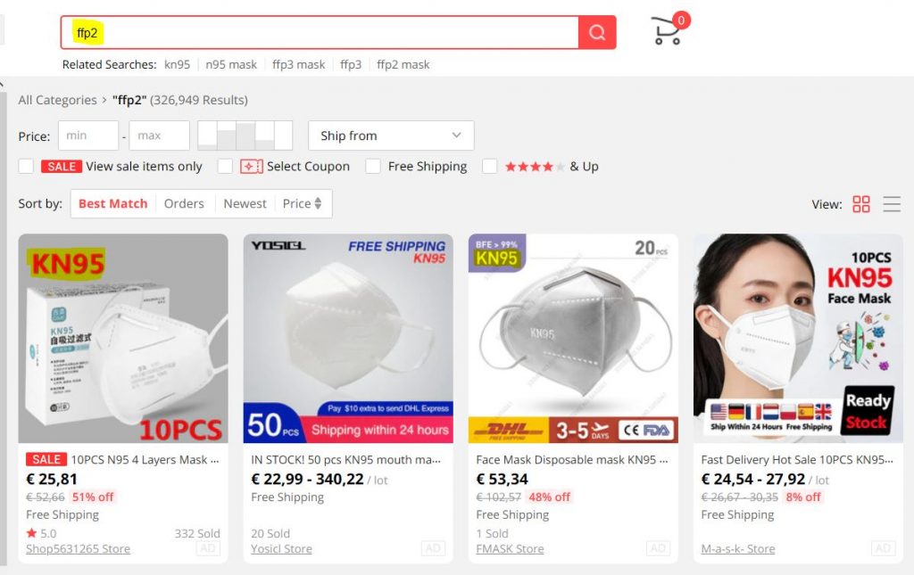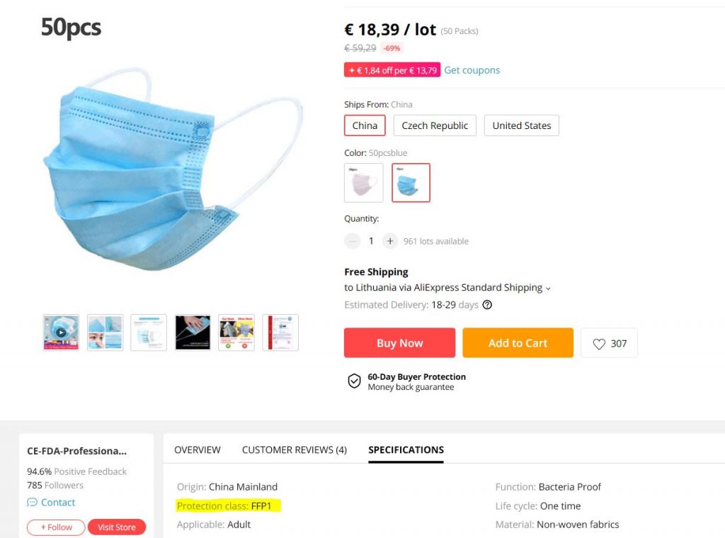 Imant pvz. Aliexpress prekių aprašymus, protection class FFP2 bus geresnė prekė nei nei FFP1: